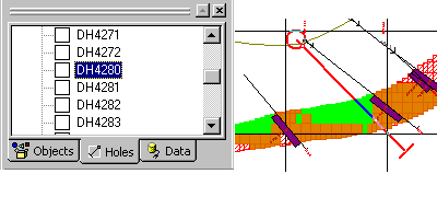 Simply select the desired hole from the list and the current section or log view will be adjusted to contain the hole. In section views the selected hole is highlighted with a red line, e.g.:
