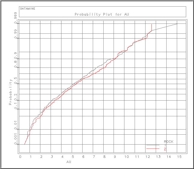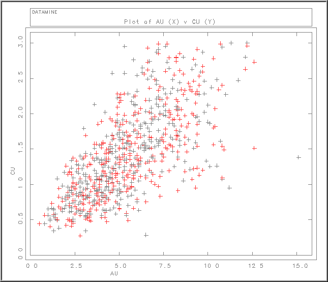 For example, data file sample1 is a desurveyed drillhole file containing fields AU, CU, ROCK and , where has been assigned according to the ROCK value.  A scattergram will show the relationship between the AU and CU values.