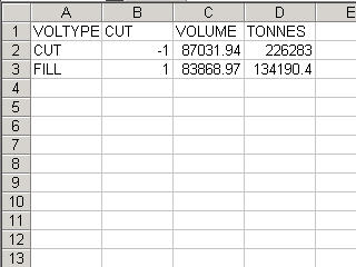The output results file contains all the evaluated tonnages and volumes, split by cut, fill and perimeter attribute. This results file is automatically also written out as a .csv file, for easy import into spreadsheet programs.