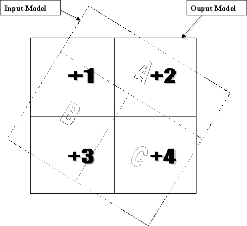 The centre point of each subcell in the output model is identified, and the subcell values are set equal to the corresponding point in the input model. If the &PROTO model file contains records then the &OUT model will have the same configuration of cells/subcells, but with values taken from the &IN model. If there is no corresponding point in the &IN model, then absent data values will be assigned in the &OUT model.