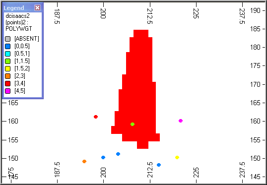 The block model has been filtered on _SAMPNUM so that only blocks corresponding to a single sample are displayed. The red blocks describe the volume of influence of the single sample (green) located inside the blocks. The samples are coloured according to the value of POLYWGT as shown in the legend.