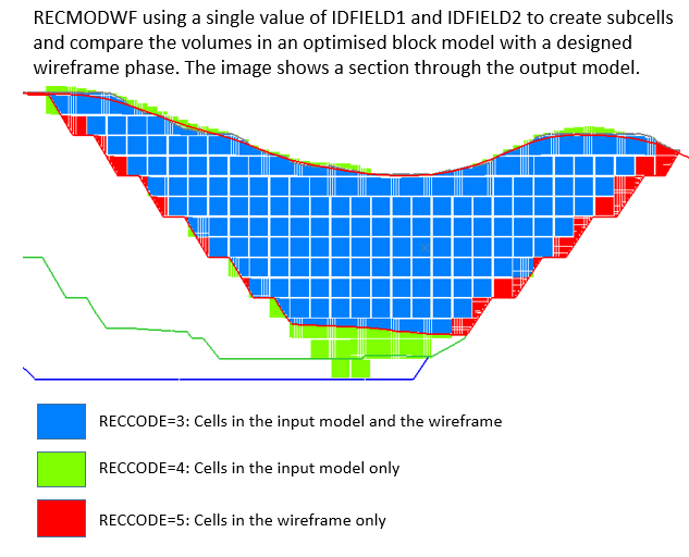 Output results file containing tonnes and grades for categories of each unique value of IDFIELD2. The categories, with value of RECCODE from 1 to 5, are as follows: