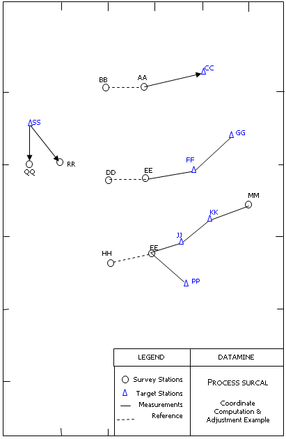 This process computes provisional and/or adjusted coordinates of all observed survey stations contained in an input file of reduced observations such as output from process SUROBS.