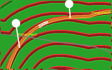 As the design data above the road has to be adjusted to fit in this adjustment over a relatively short distance, the toe and crest strings at higher benches are progressively pushed outwards (pit) or inwards (dump).