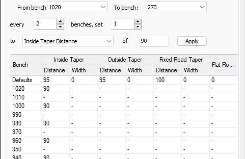 Review the Defaults table row. These tapering values are applied for all benches or lifts where a more specific constraint has not been set (that is, where a "-" appears in the table below). You can adjust any of the following default values:
