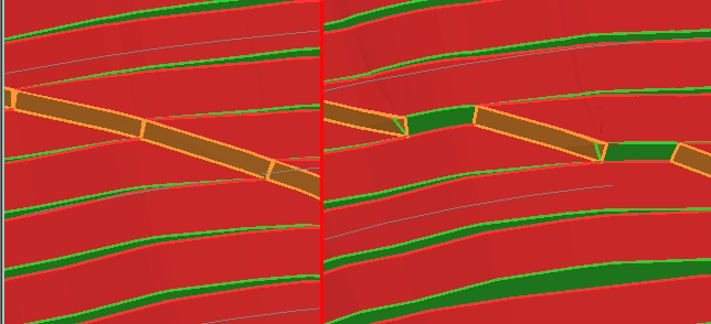 For example; consider an automated design where each road segment is approximately 200m in length. The default berm taper distance is 100m, meaning that the start of the taper has 100m in which to reach the full berm width. With automatic projections, this can give rise to a 'stepped' effect as the road rapidly reaches its target berm width over 50% of the road segment length, continuing at that width for another 100m then projecting rapidly out again, e.g.: