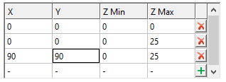 Selected Region Rosettes: when a region is selected in the Region List (see above), its current rosette information is listed here. New rosettes may be explicitly added by typing into the empty first row. Rosettes may be deleted using the delete button at the end of their row. All entries in the rosette are editable. X and Y can only be numeric. Z Min and Z Max can be numeric or absent.