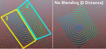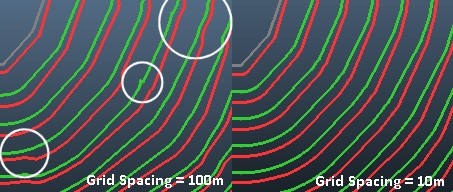 For example, the image on the right below shows the effect of a 10m grid spacing for the same region string control as shown above (a pit is displayed, but the same principle applies to dumps). The image on the left shows a grid spacing of 100m. Note that the blending Distance between regions (as set in the Auto Design task) is set to 100m at the pit level so applies to both cases. The result is that, whilst blending is applied between regions in both cases, the resolution of the grid used to control the smoothing is lower in the 100m grid spacing case, resulting in the introduction of unwanted string artefacts (in this case):