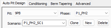 For example, for phase "P1_PH1" (pit1, phase 1), the default scenario name for the first design will be "P1_PH1_SC1", followed by "P1_PH1_SC2" and so on. This naming system is automatic and will update each time a new Pit or Phase is selected in the Auto Pit Design task.
