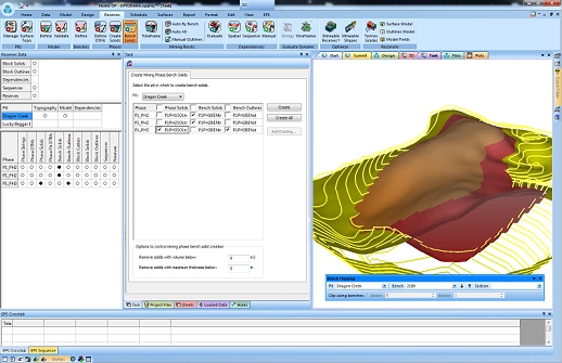 This independent approach provides several benefits; you can format data in the Task window in a manner appropriate to the display of phase and pit data, mining blocks and block sequences, without having to apply the same visual formatting to the other data in your project (for example, you may be using the 3D window to visualize grade iso-shells using a legend which is not appropriate for showing phase DTMs).