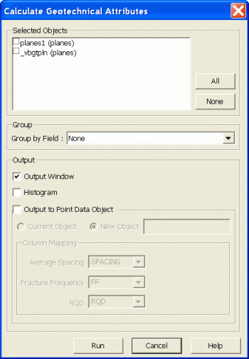 The Calculate Geotechnical Attributes dialog is used to define Selected Objects, Group and Output parameters and then calculate the average joint spacing, fracture frequency and RQD for the selected Planes.