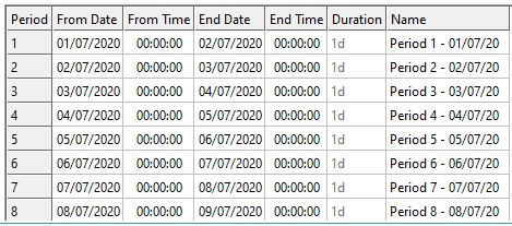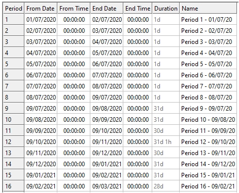Note the Duration column: the first 8 periods are "1d" and the remainder represent a calendar month's duration in days. Duration is always expressed as days in this table. - Click Apply to update the time periods settings for your project.