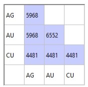 The correlation coefficient of 0.63 between AU and AG is the highest of the three grade combinations. This is shown in green as the value is above 0.6 and the p-value <0.05. The correlation coefficients for the other two lie between 0.3 and 0.6 and p-values are <0.05 so they are coloured orange.