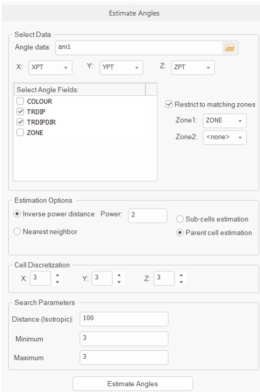 COKRIG is used for estimating TRDIPDIR and TRDIP into a block model. COKRIG offers two estimation methods for estimating angles: