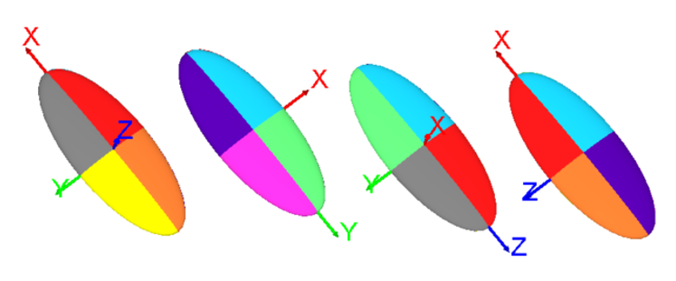 Variogram and search volume models which are identical can be presented in multiple combinations of angles. When viewed as ellipsoids, these variograms or search volume models have the same shape and orientation, although the colours are inverted representing the difference of angles.