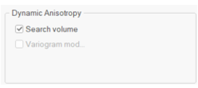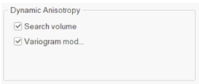 The Kriging methods support local orientation of the search volume parameters and variogram model. For these estimation types, either or both check boxes may be applied to enable or disable DA for each estimate: