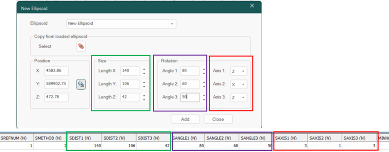 Creating an ellipsoid of a search or variogram may be done in several ways, but in the workflow described here, it is performed manually using the New Ellipsoid (command = “new-ellipsoid ”) or using the process ELLIPSE . This can also be achieved interactively using Advanced Estimation with the Display Ellipsoid tool (Define Search Vol. panel). See Define Search Volumes.