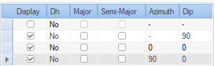 Azimuth and Dip—The direction that applies to the current item. If Major is selected, this is used to define the azimuth and dip of the major direction used for fitting. If Semi-Major is selected for the item, these values determine the azimuth and dip of the semi major fitting direction.