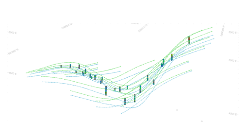Validated unfolding strings. These define the hanging wall and footwall of the zone for unfolding (named as str09_hwfw_valid.dm in the UNFOLD Wizard). See Create Unfolding Strings.