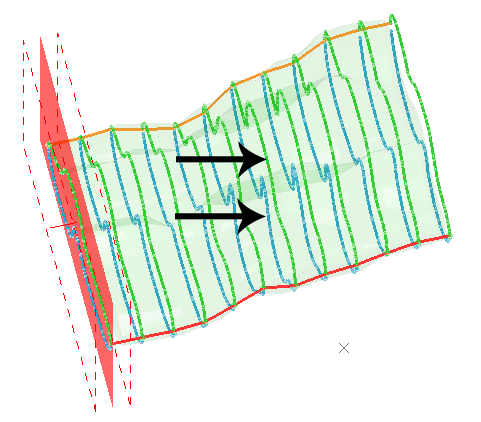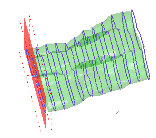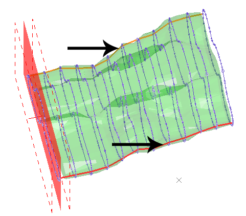 Section Slice Strings—Strings formed from the intersection of the unfolding sections and the input wireframe volume or hanging wall and foot wall surfaces. These strings are automatically saved with the object name "STR05_SEC_SLICES".