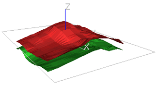 The hangingwall and footwall Digital Terrain Models (DTMs) are shown in the graphic above. The two DTMs (wireframe ORETR, OREPT) have approximately the same profile with a central ridge running east-west and dipping gently to the north and south.