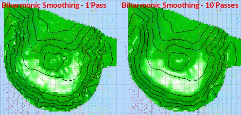 Similarly, there are multiple Smoothing options available for your contours (this will have no effect on the output grid model). The [Biharmonic] option will apply a sensible smoothing level to most inputs and parameters e.g.: