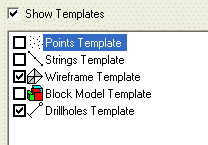 A data display template can contain variety of information. In a simple form, a template could be used to, say, color an object red, and rendered in 3D. This type of display template is relatively generic and can easily be transferred to other object overlays of the same object type (it is not possible to apply, say, a wireframe display template to a block model, for example).