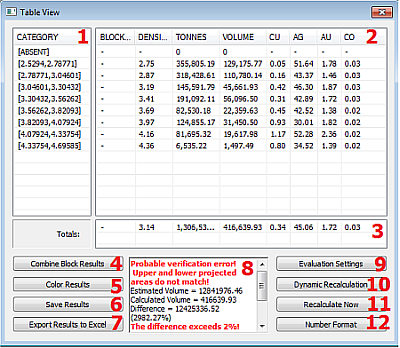 Once the wireframe volume has been established, cells falling within the evaluation zone are analyzed in relation to all of the important fields selected in the Dynamic Evaluation Settings dialog. Results for TONNES and VOLUME will always be displayed alongside the relevant BLOCKID. If additional fields were selected for evaluation, such as PHASE, SEQUENCE, VALUE, average AU grade etc. these will also be shown for each table record.