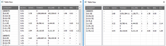 This panel is a streamlined version of the one shown using dynamic evaluation commands. Results for TONNES and VOLUME will always be displayed alongside the relevant BLOCKID. If additional fields were selected for evaluation, such as PHASE, SEQUENCE, VALUE, average AU grade etc. these will also be shown for each table record.