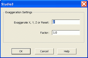 The Exaggeration Settings dialog is used to set the view exaggeration (but not the underlying data) of the Design window by increasing the scale factor along a specified axis. Each axis can be exaggerated independently of the others.