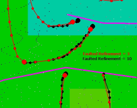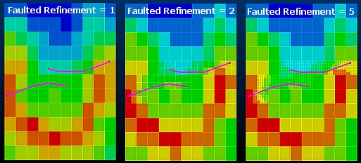 Faulted Refinement: choose how many wireframe data subdivisions are required to align data on either side of the fault with the fault string(s). This can be considered a measure of data granularity near the fault zone, with higher numbers giving rise to a closer match between the edge of the wireframe near the fault and the string itself.