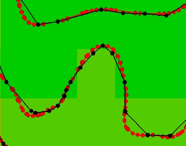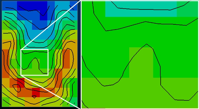 Refinement: refinement determines how much internal 'sub-sampling' occurs within your contour grid in order to achieve an accurate fit between contour strings and points. Refinement offers a processing time vs. accuracy control, with the default setting (5) offering a reasonable balance for most data inputs. A minimum setting of 3 is enforced (lower values will produce nonsensical results).