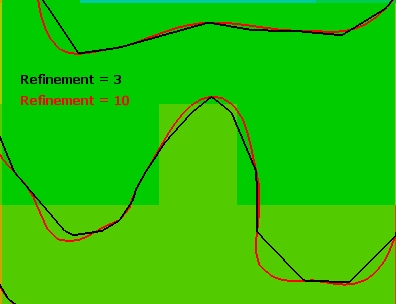 In the example below the output wireframe surface has been generated for 3 refinement settings. In each case you can see how the edge is less jagged with each jump in refinement setting. Higher values will give rise to longer processing times.