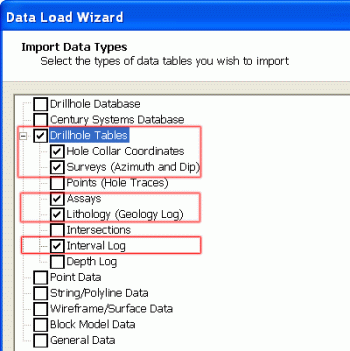 The easiest way to create dynamic drillholes is to use the wizard to load the component tables into memory. This will load each table, allocate table types (e.g. collars, surveys etc) map the fields appropriately and then desurvey the drillholes. The tables are loaded by means of the Data Load Wizard or independently using one of the following methods: