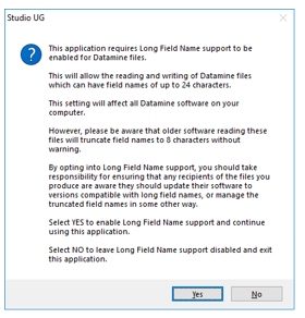 Studio UG and Studio Survey require Long-Field support to operate. If your system is running in Short-Field mode when your application is launched, you will be required to enable Long-Field support and (if required) log out and back into a new Windows session.