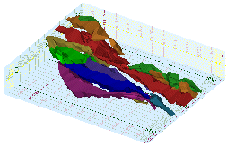 The display above shows grid lines superimposed for all 3 axes. In this situation, it can be difficult to determine the information the grid is presenting. your application's Interactive Grid facility resolves this by creating a grid as (optionally) a 3D data object. The same geological model, when rendered in 3D, with a 3D grid overlay is much easier to interpret as it gives a more visually informative feedback of the dimensions of the model: