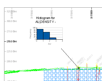 The following series of image shows a histogram plot item that has been inserted as a locatable plot item. The plot item is of the 'point' variety (more about point and line varieties later), and has been set to show a connecting line between it and the interactively selected point on a specific collar position. The plot is being panned in each image, to the right: