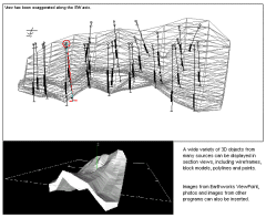 Horizontal (benched), inclined and vertical sections can be quickly defined using the Section Wizard by selecting the section type, section azimuth, section width and the center point coordinate of any one of the sections. The creation of plan and 3D views is a simple one step process. For more information on creating and editing sections, see Creating and Defining Sections. Having created the default section, plan or 3D view, the section definition, page size and view settings can then be modified as required. Changes made to the section definition can be displayed dynamically to give the user immediate feedback on the effect of changing one or more settings.