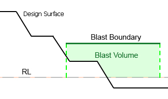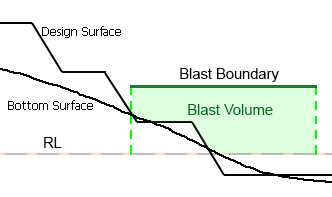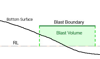 Bottom Surface: the bottom surface of the blast volume will be the specified reference level (Blast RL) unless it is constrained by another surface. Enter an elevation value for the bottom surface of the blast volume here.