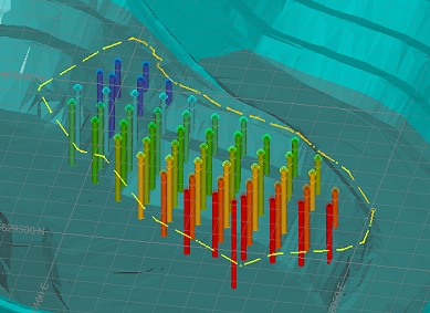 The inputs to this command will be, typically a set of planned blast hole collar positions or a set of points indicating the top surface, plus a blast outline (closed perimeter) which will be expanded by a set amount (commonly half the design burden) or snapped to a crest string. This closed string is used to define the volume boundary, projected to the specified RL unless constrained by an input 3D surface or pit geometry.