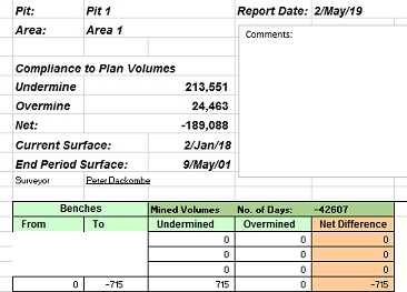 - A Compliance to Plan report showing the undermined/overmined results (total and per-bench) for the reporting period. The data for this report was generated by the Plan Compliance reporting tool. More...