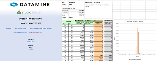 - A Compliance to Design report showing the undermined/overmined results (total and per-bench) for the reporting period. The data for this report was generated by the Design Compliance reporting tool. More...