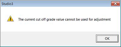 Cut-off grade: This method uses a defined cut-off grade and adjustment step size to control the adjustment of the ore outline. The cut-off grade is set using the command set-adjustment-cut-off; the default value for the cut-off grade is absent (-).The field used to define ore is the block model data column currently colored by a Legend, as defined in the Color tab of the Format Display dialog. Once set, the same value will be used until it is changed. If the adjustment is attempted with an absent cut-off grade, the following error message is displayed: