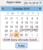 When you select a date for reporting, the calendar tool can be used to see previous report date(s). These are highlighted in red, e.g.:
