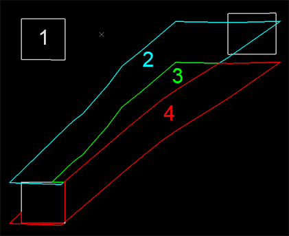 Consider the following example, showing a cross section of a designed stope from MSO (2) and a surveyed stope wireframe (3+4) and upper and lower development survey wireframes (both represented by 1):