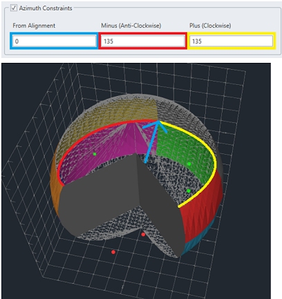 Refer to the following visualization, taking note of the corresponding annotations in the azimuth constraint settings and the search geometry when visualized.