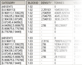 Once the wireframe volume has been established, cells falling within the evaluation zone are analyzed in relation to all of the important fields selected in the Dynamic Evaluation Settings dialog. Results for TONNES and VOLUME will always be displayed alongside the relevant BLOCKID. If additional fields were selected for evaluation, such as PHASE, SEQUENCE, VALUE, average AU grade etc. these will also be shown for each table record.