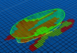 A volume is then calculated by projecting all loaded strings in both directions. For example, representing one of the loaded strings, the yellow circle below has identical near and far projection distances, and the cylindrical volume formed is used to evaluate the loaded block model: