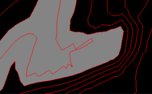 The effect of this setting can be hard to visualize, but is best described by means of an example. The following image shows a magnified section of a topographical contour string file. The area highlighted in grey represents the area where most 'decision making' must be made by any surfacing routine, due to the multitude of options for connecting separated vertices: