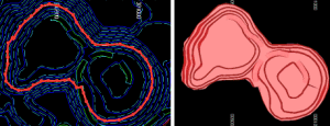 The important point to note about the central image is that, despite the presence of green pit road strings rising out of the pit base in the original image, these strings are not closed, and as such, it is either the surrounding blue bench strings that are used to colour these features or the cyan colour representing the lower pit contours - this is because these are the closest closed strings the encapsulate the wireframe triangle centroids of the pit road. Similarly, the extensive green area surrounding the pit contours doesn't tally with the first image; this is expected as the red / turquoise / orange contours do not represent fully closed strings. Although not shown in the image, the entire surrounding topography is enclosed by a green contour line, and it is the green attribute that is used to colour this DTM region.